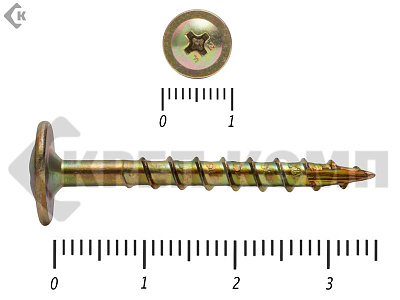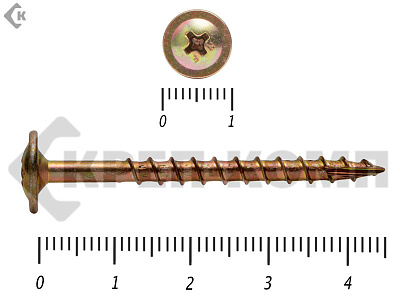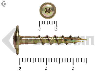 Саморезы с увеличенной головкой (прессшайбой). Изготавливаются из углеродистой стали и покрываются желтой гальванической оцинковкой. Такая форма головки, позволяет увеличить прижимную способность самореза. Служат они для крепления тонких деревянных и пластиковых декоративных элементов, к деревянному основанию.